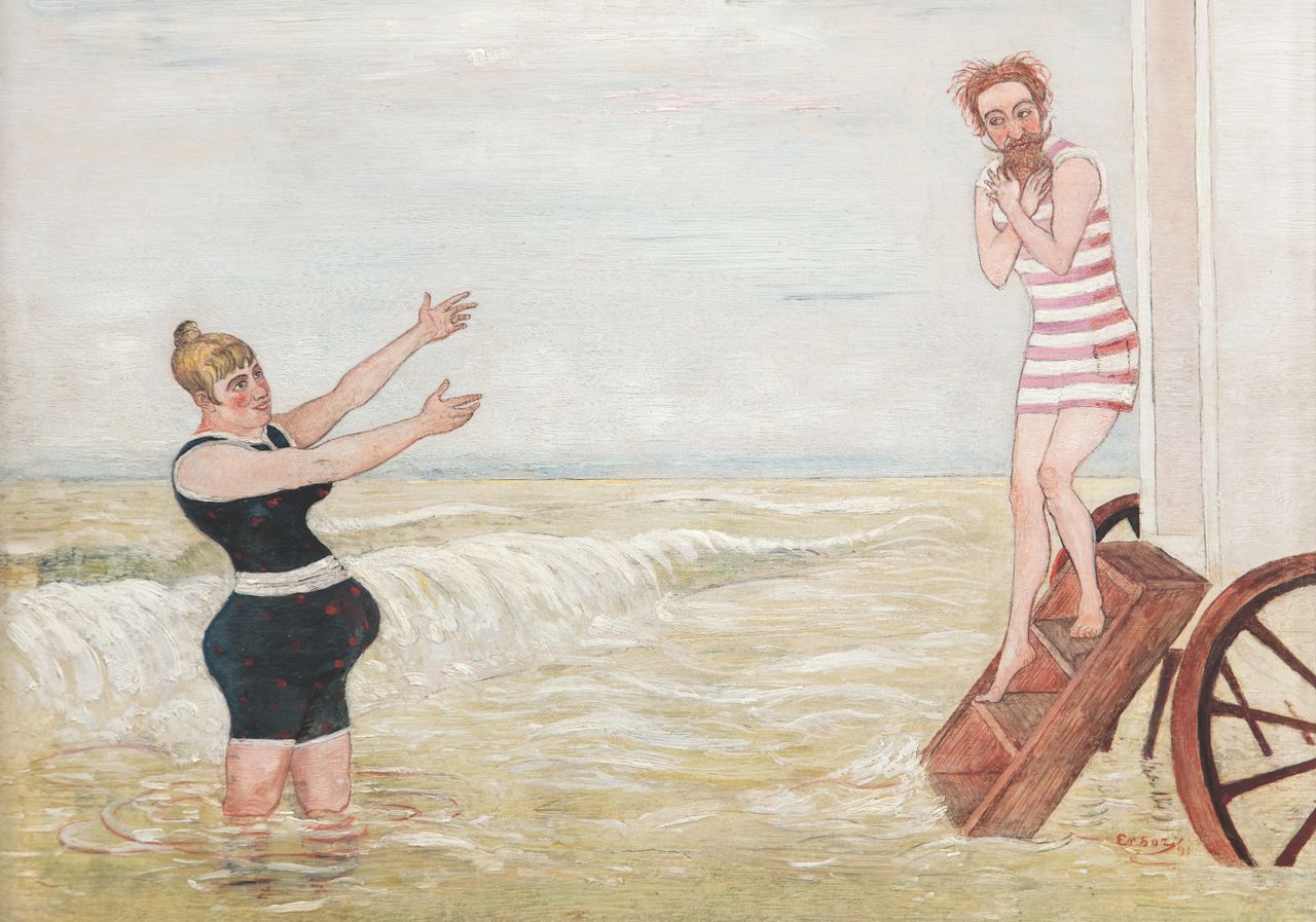 À Ostende/La Peureuse, représentant une scène de plage montrant un homme, les pieds dans l’eau, encourageant une femme à descendre les marches d’une roulotte de bain pour le rejoindre. L’image du tableau fut cependant reproduite sur des cartes postales et des coquillages, vendus dans des boutiques de souvenirs à Ostende, comme